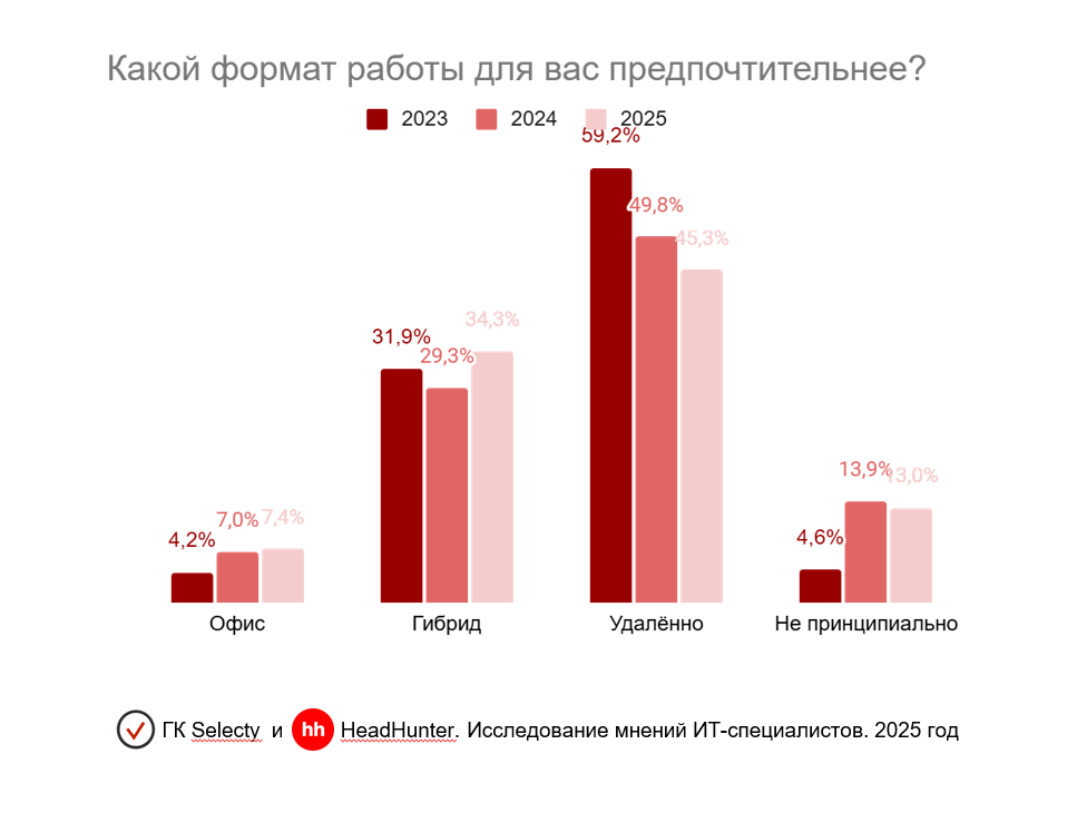 При этом доли тех, кто уже работает удаленно, и тех, для кого этот формат является оптимальным, совпадают. Текущее распределение работающих ИТ-специалистов выглядит следующим образом: