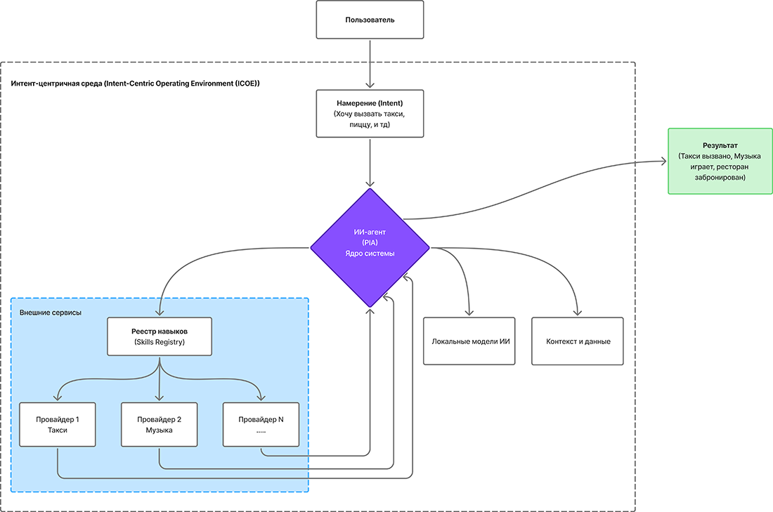 Это не улучшение голосового помощника. Это смена парадигмы управления. Я называю это интентоцентричной средой (Intent-Centric Operating Environment, ICOE). Ее ядро не операционная система, а ваш персональный проактивный агент (Proactive Intelligent Agent, PIA) — цифровое продолжение вашей воли. Это кажется очевидным, но как для этого изменить наши устройства, какова должна быть архитектура — вот главный вопрос.