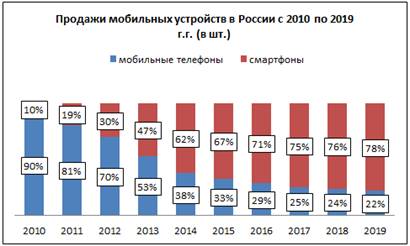 За последнее десятилетие россияне приобрела около 400 млн мобильных средств связи на сумму почти 3 триллиона рублей. Но если в 2010 году только 10% пользователей выбирали «умные» устройства, то в 2019 году на каждые три приобретённых смартфона пришёлся только один мобильный телефон.