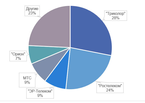 Проникновение сервисов платного ТВ находится на уровне 80%. Средний чек на одного абонента (ARPU) — 190 руб. в месяц. Объем рынка в денежном выражении в 2019 превысил 100 млрд руб., что соответствует росту в пределах 5%.