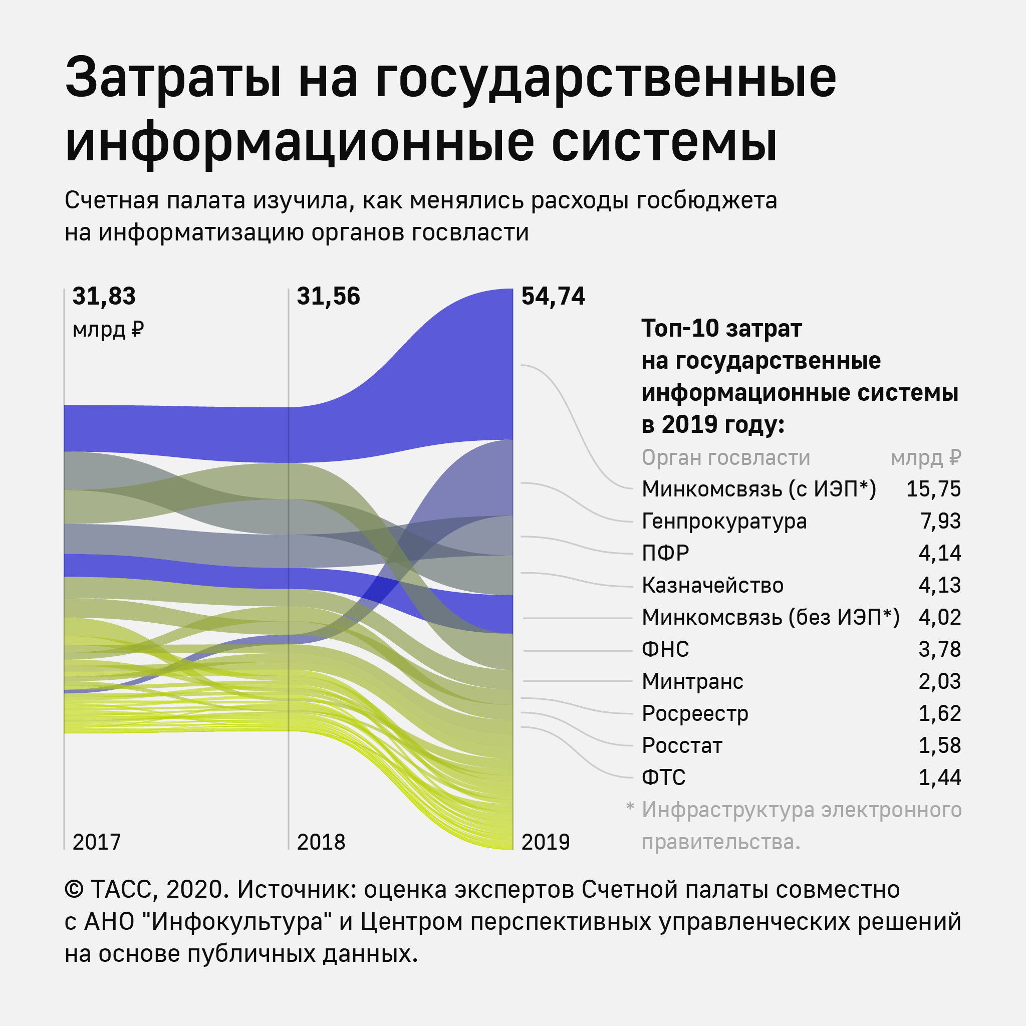 Сейчас в России функционирует 876 информационных систем федерального уровня (уточненные данные ФГИС координации информации). Суммарные расходы на них за 2017–2019 годы составляет 60-75 млрд рублей, включая затраты на центры обработки данных и инфраструктуру электронного правительства. Это около 50-60% от всех IT-бюджетов госорганов.