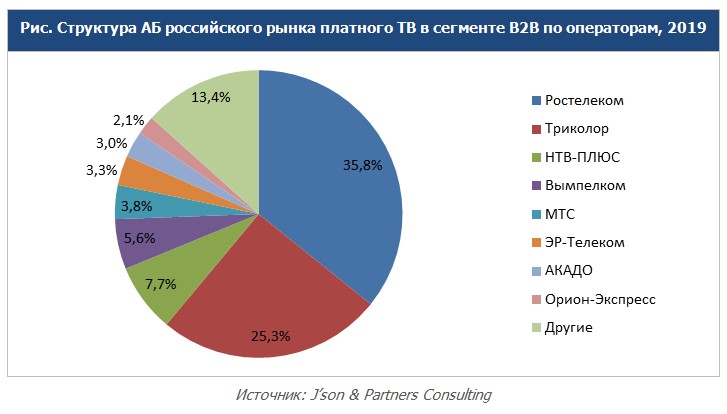 По оценкам J'son & Partners Consulting в 2019 году количество корпоративных клиентов на платное телевидение в сегменте B2B составило 104,8 тыс., рост по отношению к предыдущему году составил 13%. Структура абонентской базы по операторам представлена на рис. ниже.
