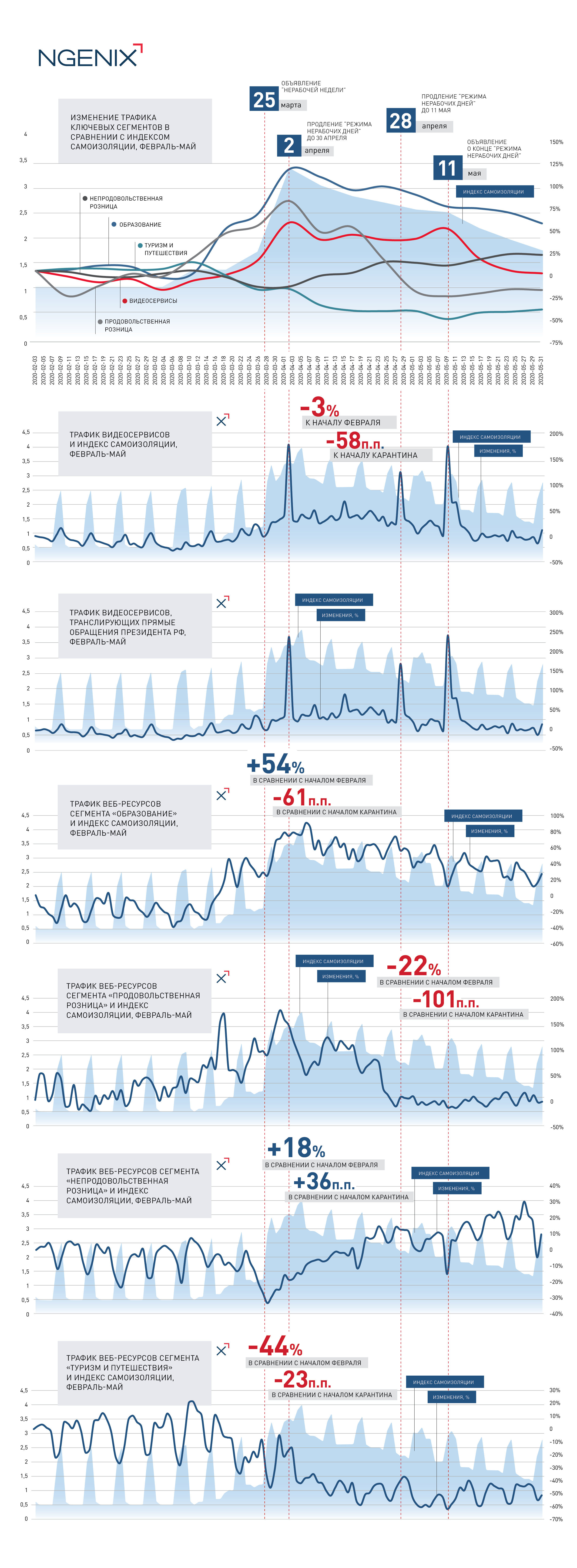 Компания NGENIX провела анализ трафика веб-ресурсов в мае. Данные NGENIX за два месяца карантина, объявленного ввиду пандемии COVID-19, демонстрируют, как пользователи реагируют на смену обстановки в свете мер по самоизоляции.