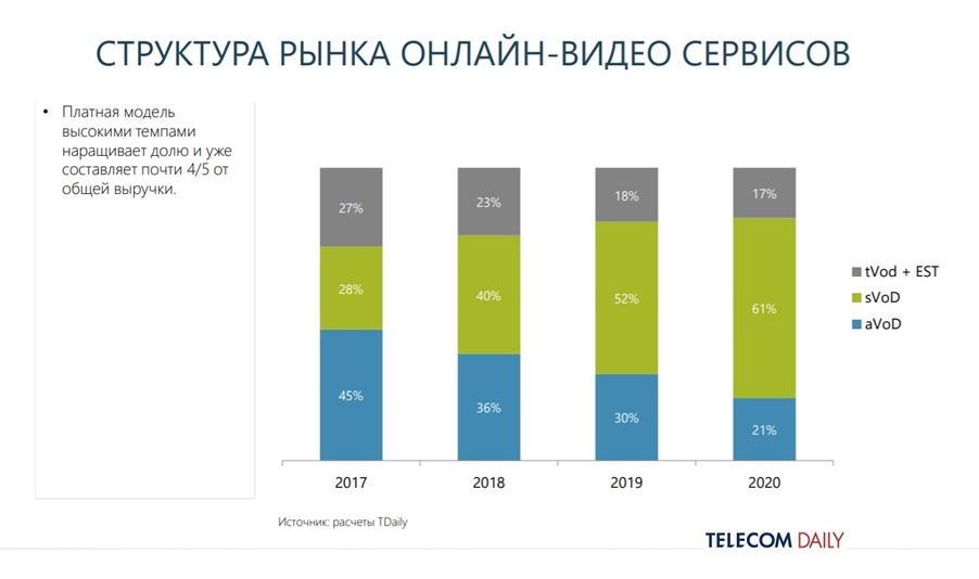 Платная модель продолжает наращивать долю и доминировать над рекламной. Если в структуре выручки онлайн-видеосервисов по итогам 2019 года ее доля составила чуть более 70%, то сейчас уже превышает 78%.