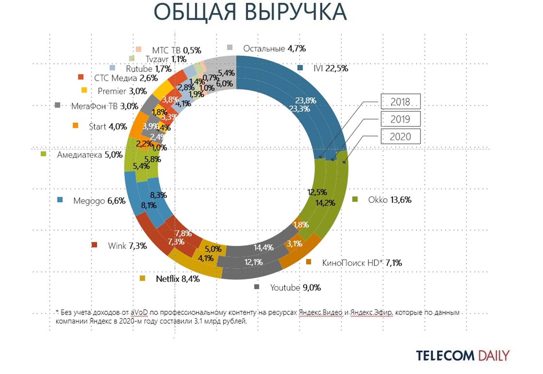 Среди игроков по объему выручки лидирует ivi — за год его доля немного снизилась и составляет 22,5% против 23,8% в 2019. У Okko за тот же период доля составила 13,6% против 14,2% годом ранее. У Youtube выручка снизилась более значительно, до доли в 9% (в 2019 — 12,1%, в 2018 — 16%). При этом доля Netflix выросла более чем в два раза, до 8,4% (против 4,1% в 2019).