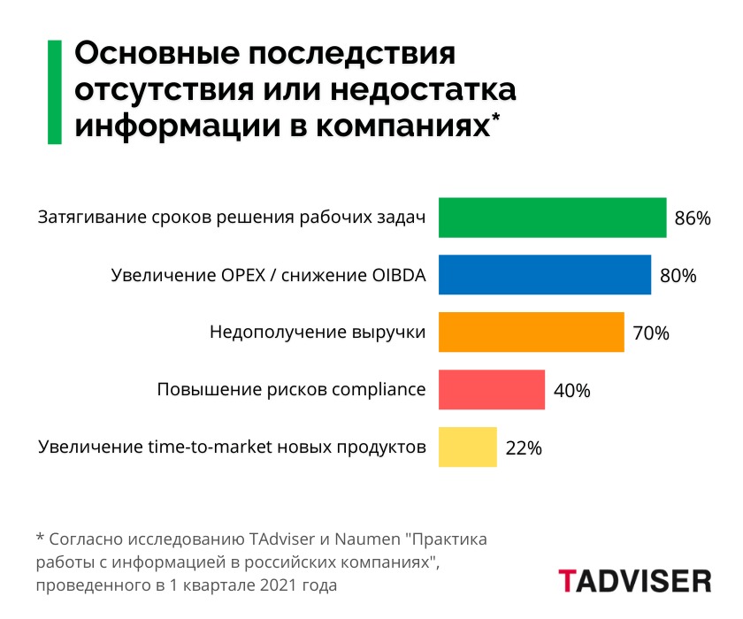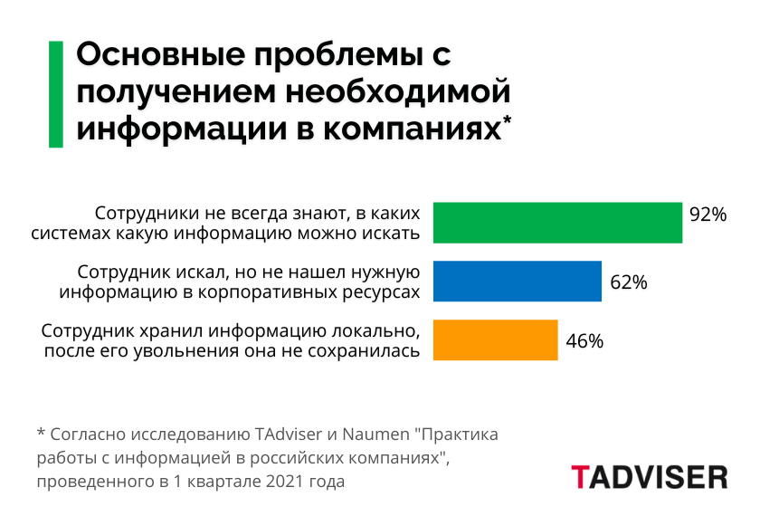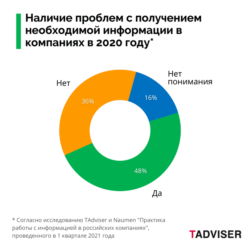По данным опроса, проведенного аналитическим агентством TAdviser совместно с компанией Naumen в 1 квартале 2021 года, около половины российских организаций (крупных промышленных структур и верхнего сегмента среднего бизнеса) сталкивались в 2020 году с проблемами в получении необходимой информации для решения рабочих задач.