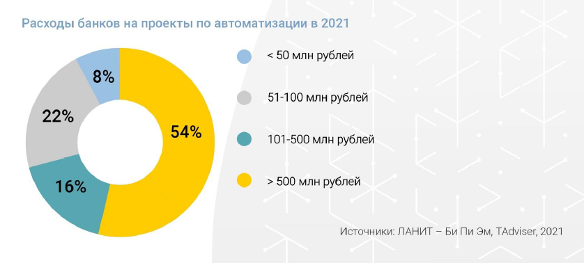 По сравнению с предыдущими тремя годами, в 2021 году бюджеты на автоматизацию увеличились у 44% опрошенных. Еще 36% отметили, что размер выделяемых средств не изменился. Более чем у половины опрошенных (в основном, крупных банков) расходы на автоматизацию в 2021 году превысили 500 млн руб.