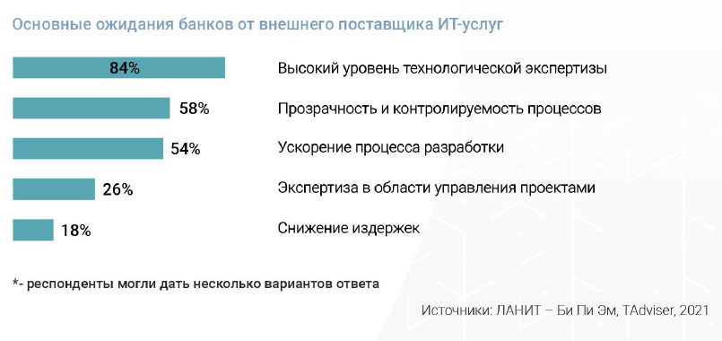 Более половины опрошенных банков сочетают при реализации проектов автоматизации как внутреннюю разработку, так и услуги внешних поставщиков. 18% стремятся использовать преимущественно инсорсинг, и 16% - аутсорсинг. При взаимодействии с внешним поставщиком ИТ-услуг более 80% опрошенных банков рассчитывают прежде всего на высокий уровень его технологической экспертизы.