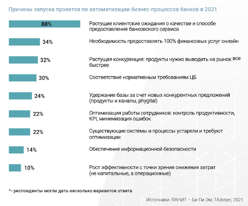 Основной драйвер новых проектов по автоматизации в банках – растущие ожидания клиентов относительно качества и способа доставки сервисов (88%). Более трети респондентов отмечают необходимость предоставлять 100% банковских услуг онлайн, а также быстро выводить на рынок новые продукты в условиях ужесточающейся конкуренции.