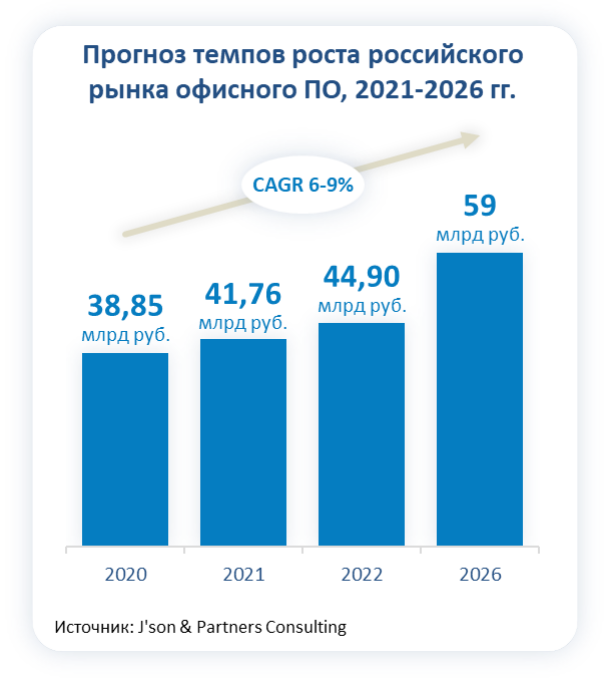 Как отмечают аналитики, несмотря на высокую насыщенность, рынок продолжает умеренно расти: по оценкам J’son & Partners Consulting среднегодовой темп роста (CAGR 2021-2026 гг.) составит 6-9%. К 2026 году структура рынка существенно изменится: доля зарубежного ПО снизится в 2,6 раза, а доля отечественного офисного ПО увеличится с 7% до 40%. Основными драйверами являются активные действия государства по поддержке отечественных производителей, импортозамещению и легализации использования программного обеспечения, поддержка развития открытого ПО со стороны государства, усиление требований государственных и коммерческих организаций по наличию контроля над хранением данных, рост лояльности потребителей к российскому ПО, а также повышение бизнес-рисков использования зарубежного ПО и рост его стоимости из-за санкций.