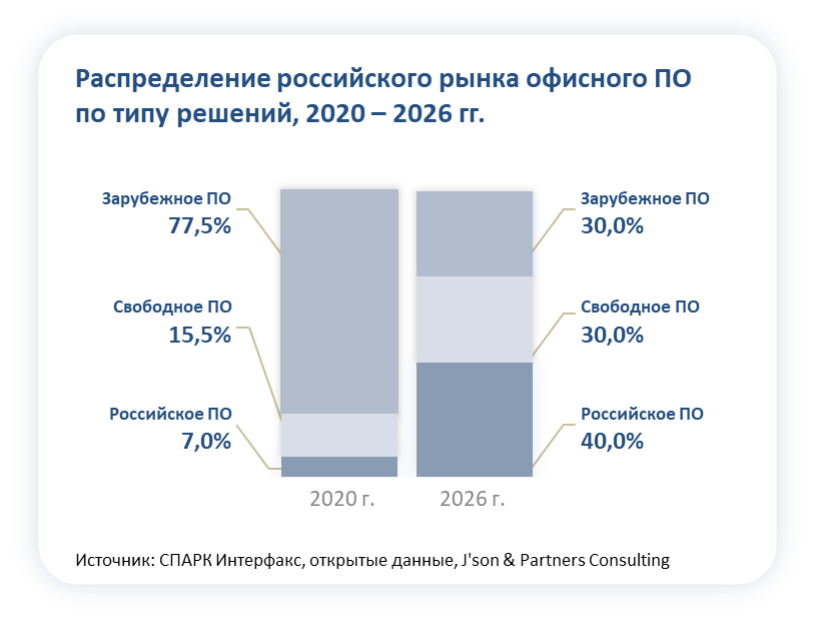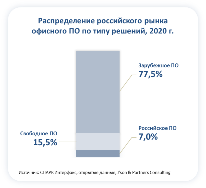 По оценкам J’son & Partners Consulting, 77,5% рынка офисного ПО в 2020 году занимали продукты зарубежного ПО (Microsoft Office, Hancom Office, WPS Office и т.д.), 15,5% приходится на свободное ПО (LibreOffice и OpenOffice), 7% на российское ПО («МойОфис» от Новые Облачные Технологии, решения «Р7-Офис» от Р7).