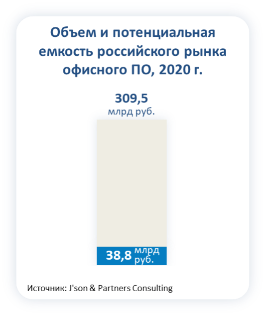 Согласно оценкам J’son & Partners Consulting, на 2020 год общий объем российского рынка офисного ПО составил 38,8 млрд. рублей, где большая доля приходится на коммерческий сектор (26,2 млрд. руб.), на втором месте государственный сектор (9,9 млрд. руб.). С учетом уровня распространенности альтернативных решений потенциальная емкость рынка может достигать, по оценкам экспертов агентства, 309,5 млрд. рублей.