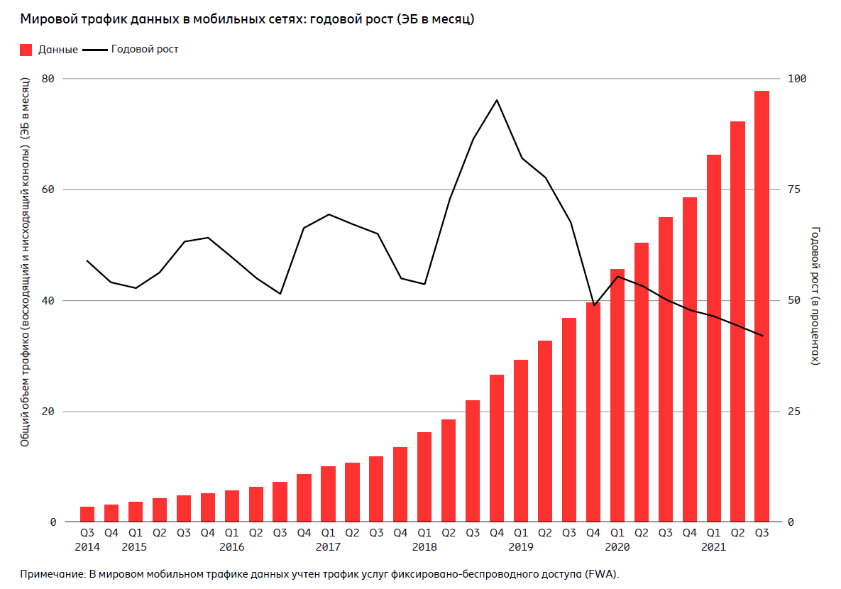 Мобильный трафик данных только в третьем квартале 2021 года оказался больше трафика, сгенерированного в мобильных сетях за весь период до конца 2016 года.