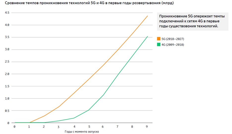 Начиная с 2011 года к мобильным сетям по всему миру были подключены 5,5 млрд смартфонов. Это произошло благодаря распространению технологии 4G LTE — всего было представлено более 20 000 различных моделей 4G-устройств. Технологии 5G развиваются быстрее связи предыдущего поколения — на 5G-смартфоны приходится 23% мировых продаж по сравнению с долей всего в 8% у 4G-устройств на аналогичном этапе жизненного цикла.