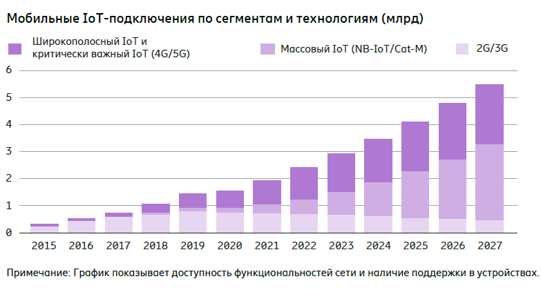 В частности, технологии массового интернета вещей применяются в носимых медицинских устройствах, для логистических целей и отслеживания перемещения товаров в рамках умного производства, а также для мониторинга состояния окружающей среды и передачи показаний умных счетчиков. Технологии Massive IoT в ближайшие годы получат широкое распространение по всему миру — на их долю будет приходиться 51% IoT-подключений в 2027 году.
