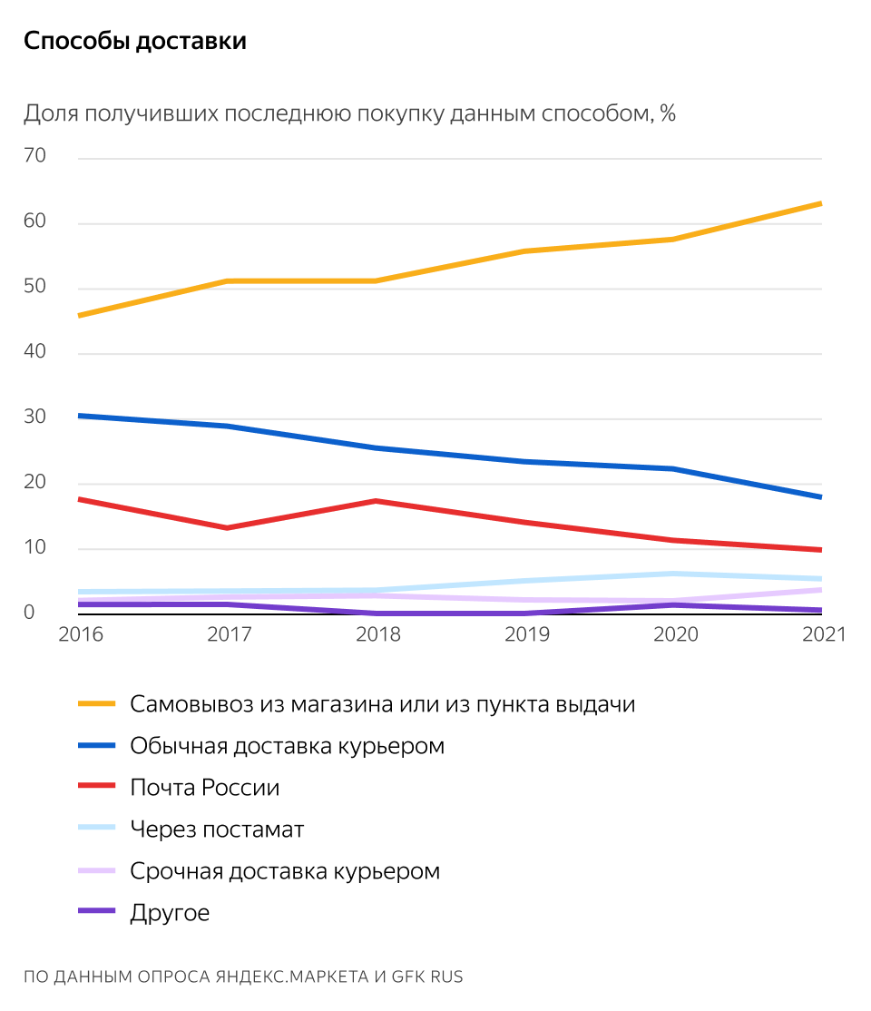Наиболее распространённый способ получения заказа — самовывоз из магазина или пункта выдачи, так получили свои последние покупки почти две трети опрошенных. На втором месте — доставка курьером, на третьем — почта. Срочной курьерской доставкой пользовались почти в два раза чаще, чем в прошлом году.