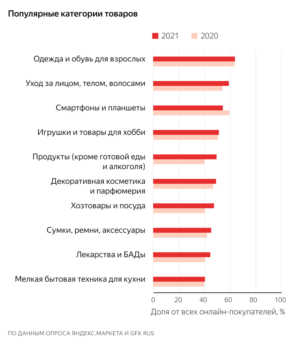 Категория товаров, пользующаяся самым широким спросом, — одежда и обувь для взрослых: эти товары хотя бы раз в течение года покупали 64 % респондентов. На второе место поднялись средства для ухода за лицом, телом и волосами (59 %). Заметнее всего, почти на четверть, расширился спрос на продукты питания (50 %) — они занимают пятую строчку в топе.