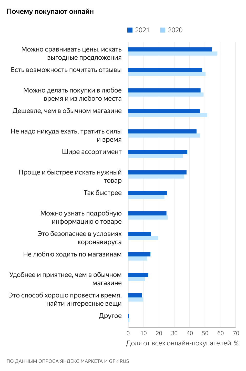 Главная причина покупать онлайн — возможность сравнивать цены и искать выгодные предложения, её в своём списке причин назвали 55 % респондентов. Каждый второй опрошенный отметил возможность почитать отзывы, примерно так же часто респонденты указывали на сравнительно низкие цены и возможность делать покупки в любое время и из любого места.