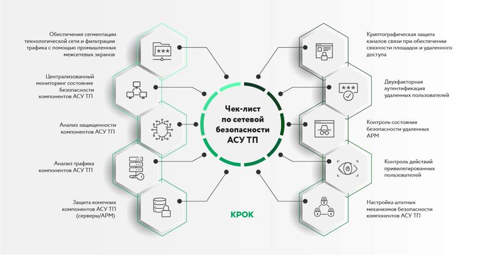 По мнению экспертов КРОК, чек-лист по сетевой безопасности АСУ ТП включает в себя, прежде всего, внедрение эшелонированной защиты при сопряжении технологического и корпоративного контуров: обеспечение сегментации сети и фильтрации трафика с помощью промышленных межсетевых экранов. Объекты промышленной автоматизации должны быть оснащены компонентами централизованного мониторинга, а также системами обнаружения и предотвращения вторжений. Доступ с удаленных рабочих мест необходимо осуществлять с помощью настройки VPN-клиента, двухфакторной аутентификации, антивирусной защиты, средств контроля абонентских устройств и действий пользователей. Данный набор инструментов и алгоритмов действий позволит создать замкнутую безопасную среду, в которой все объекты на сетевом уровне взаимодействуют через защищенные и контролируемые каналы связи.