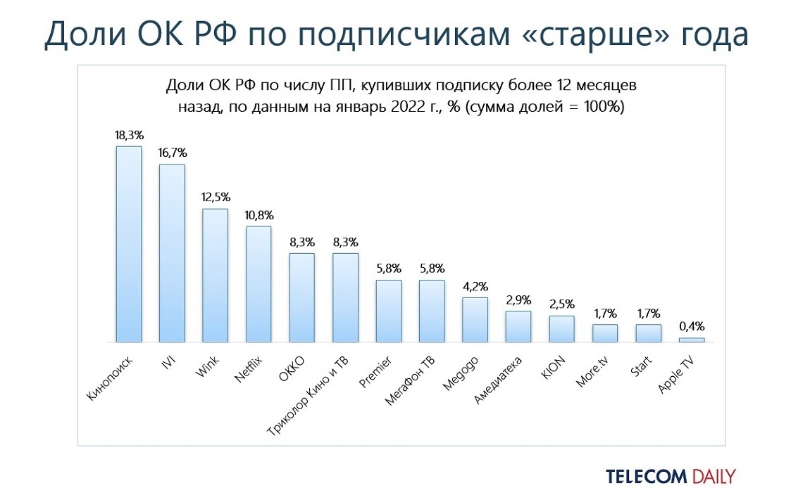 По итогам 2021 года первая пятерка онлайн-кинотеатров (ivi, «Кинопоиск», Okko, Netflix, Megogo), лидирующих по количеству зрителей, почти тем же составом удерживает верхние строчки и по количеству платных подписок. А вот в топе кинотеатров с самыми лояльными пользователями (теми, кто платит за сервис больше года) картина меняется: «Кинопоиск», ivi, Wink, Netflix и Окко.