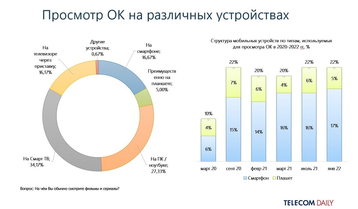 Более 50% пользователей онлайн-кинотеатров выбирают просмотры с телевизоров (34,17% используют приложения в «Смарт ТВ», 16.17% выходят через ТВ-приставку). Ноутбук/ПК задействуют 27,33%, с мобильных устройств выходят 21,67%.