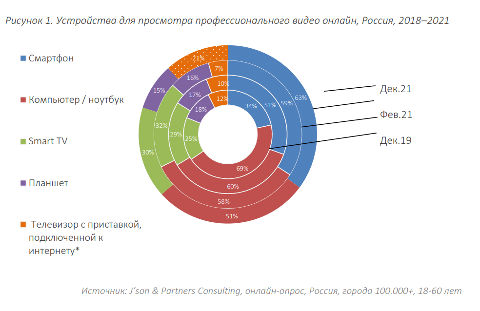 В 2021 году самым популярным для просмотра видео в интернете у всех зрителей стал смартфон 63%, на втором месте компьютер или ноутбук 51%, и третье место занимает Smart TV - 30%.