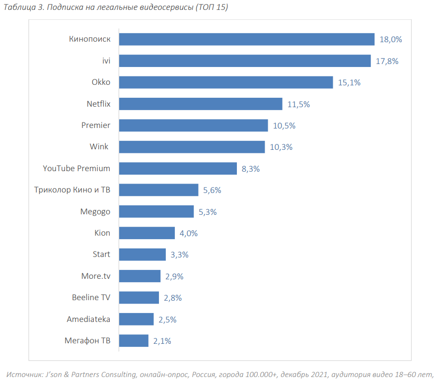 Компания J’son & Partners Consulting ежегодно проводит онлайн-исследование в российских городах с населением от 100 000 человек, основной задачей которого является выявление особенностей просмотра профессионального видео контента. По данным нашего исследования наиболее популярными с точки зрения подписки являются Кинопоиск, ivi и Okko – 18%, 17,8% и 15,1% опрошенных соответственно. Кинопоиск впервые занял первую строчку в этом исследовании.