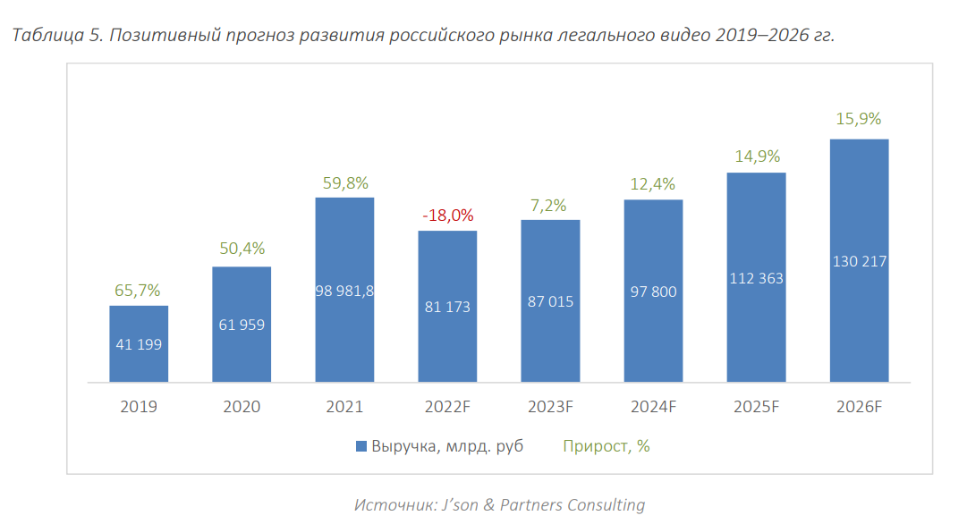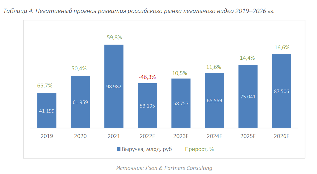По итогам 2022 года рынок может упасть на 46,3%. Выручка онлайн-видеосервисов составит 53,2 млрд.