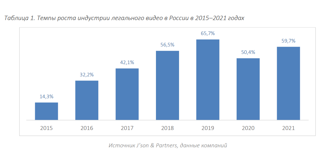 Индустрия легального видео в России продолжает поддерживать высокие темпы роста. После скачка в 2019 (65,7%) и некоторого замедления в 2020 (50,4%), в 2021 году объем выручки вырос на 59,8%.