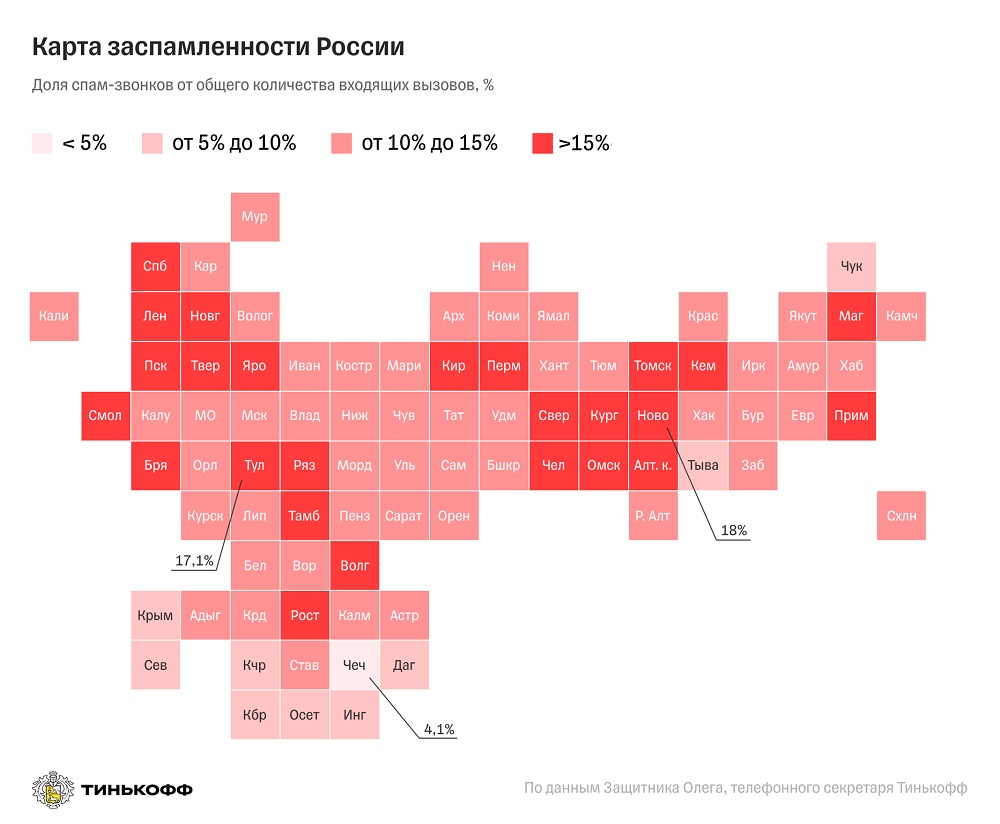Исследование учитывает данные сервиса «Защитник Олег» — бесплатного телефонного секретаря от Тинькофф. В статистике приведены обезличенные данные звонков более 1 млн пользователей Олега со всей страны.