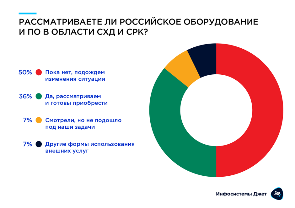 Российское оборудование и ПО для хранения данных и резервного копирования готовы приобрести 36% респондентов. Противоположную позицию заняли 7% опрошенных, считая, что оно им не подходит. Большая же часть опрошенных (50%) пока не приняла решения об использовании отечественных технологий.