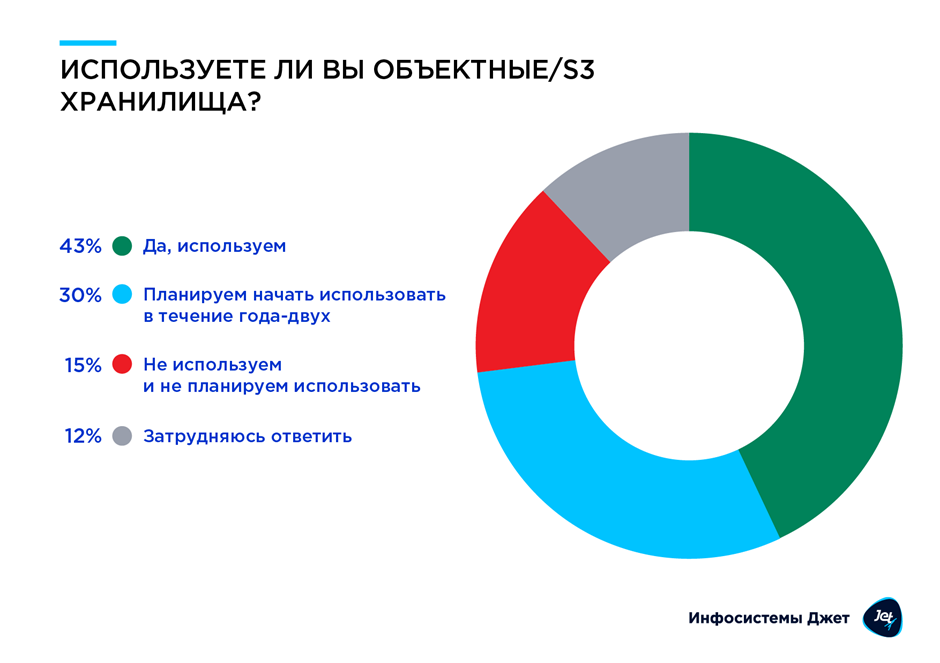 В отношении объектных/S3 хранилищ респонденты высказывались в большинстве своем положительно. Эту технологию уже задействовали 43% компаний и еще 30% планирует применить в ближайшее время.