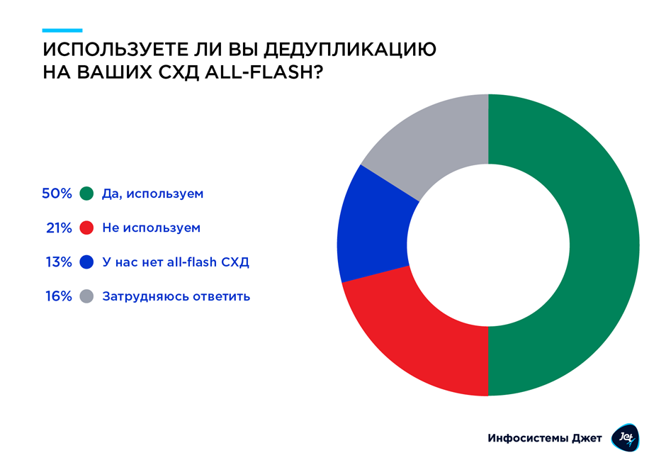 Чтобы оптимизировать хранение данных, половина компаний применяют дедупликацию. При этом диапазон коэффициента сжатия, названный респондентами, обширный — от 1:2 до 1:25. Дедупликация не используется в 21% компаний, большинство из них (62%) считает, что она им не нужна.