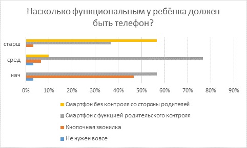 Функция родительского контроля – обязательное требование к смартфонам, которыми ИБ-родители готовы снабдить своих детей. Телефон в бесконтрольное пользование детям из начальной школы не готов доверить ни один из опрошенных, в средней школе – только 10%. Да и у старшеклассников в смартфоне должна быть функция родительского контроля, считает 43% опрошенных.