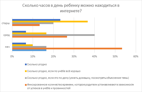В вопросе того, сколько времени детям можно проводить в интернете, ИБ-специалисты менее непреклонны. 17% опрошенных считают, что школьники начальной школы могут находиться в интернете сколько угодно, при этом 7% разрешают это, даже если по учебе не все идеально. В средней школе 25% опрошенных разрешили бы детям неограниченно пребывать онлайн. А в старшей сговорчивых уже 60%, 38% из них не будут препятствовать нахождению ребенка в интернете при условии, что не падает успеваемость.