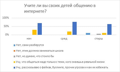 Но если аккаунт есть, родители должны брать ответственность за обучение безопасному поведению в интернете. Среди опрошенных нет ни одного, кто считал бы, что это ответственность школы. И почти нет тех, кто готов оставить ребенка один на один с этим вызовом. Большинство, от 53% до 57%, сказали, что учат детей, как распознавать фейки, социальную инженерию, как реагировать на буллинг.