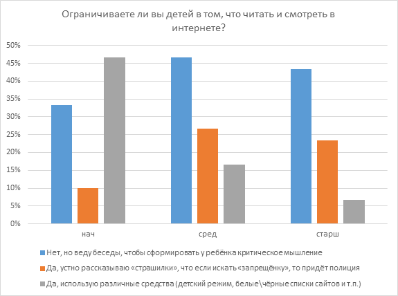 Также на сознательность ставят опрошенные и в вопросе того, что читать и смотреть в интернете детям. 47% используют для ограничения детский режим в устройствах и сервисах, но это родители учеников начальных классов. Большое же число родителей предпочитают не вводить запреты, а беседовать с детьми и делать совместные выводы. Даже среди родителей маленьких детей такого мнения придерживается 34% опрошенных.