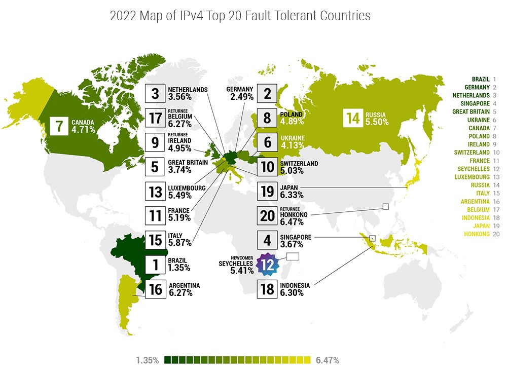 Ситуация с внедрением протокола нового поколения IPv6 пока далека от идеальной, и в этом году, по сравнению с прошлым, общие показатели IPv6 даже ухудшились. Для попадания в Топ-20 по IPv6 достаточно иметь не более чем 10% отказа, что само по себе уже является достаточно высоким показателем. На данный момент показатели по IPv6 пока хуже, чем по IPv4, поскольку к внедрению нового протокола пока приступили в основном крупные операторы. В некоторых странах таким оператором может быть, например, Google, и в случае его отказа другие игроки останутся без всякой коммуникации.