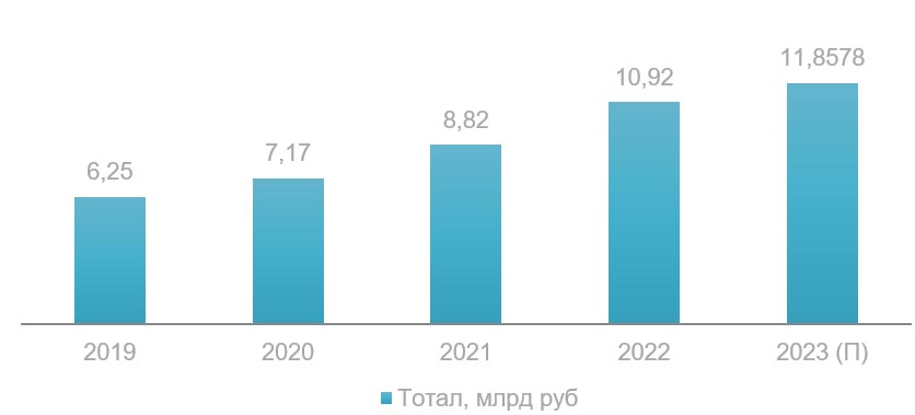 В денежном выражении расклад на рынке отличается незначительно. В течение года, с конца 2021 по конец 2022-го, выручка прибавила — с 8,8 млрд руб. до 10,9 млрд, то есть на 24%. Для сравнения, с 2019 по 2020 — на 14%, с 2020 по 2021 — на 22%. Таким образом, текущий период оказался наиболее успешным с точки зрения роста выручки.