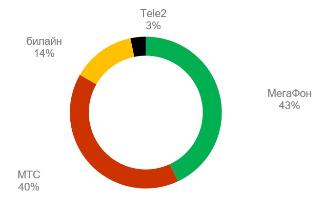 На двух из четырех операторов приходится сразу 83% рынка в штуках. Так, «МегаФон» обслуживает 43% М2М/IoT SIM-карт , МТС — 40%, у «Билайна» —14% , у Tele2 — 3%.