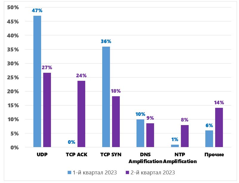 Суммарная доля TCP ACK и TCP SYN составила 42%, UDP-флуд по-прежнему занимает второе место. При этом число таких атак сократилось с 47% до 24%, стабилен уровень атак типа DNS Amplification – в районе 9-10%.