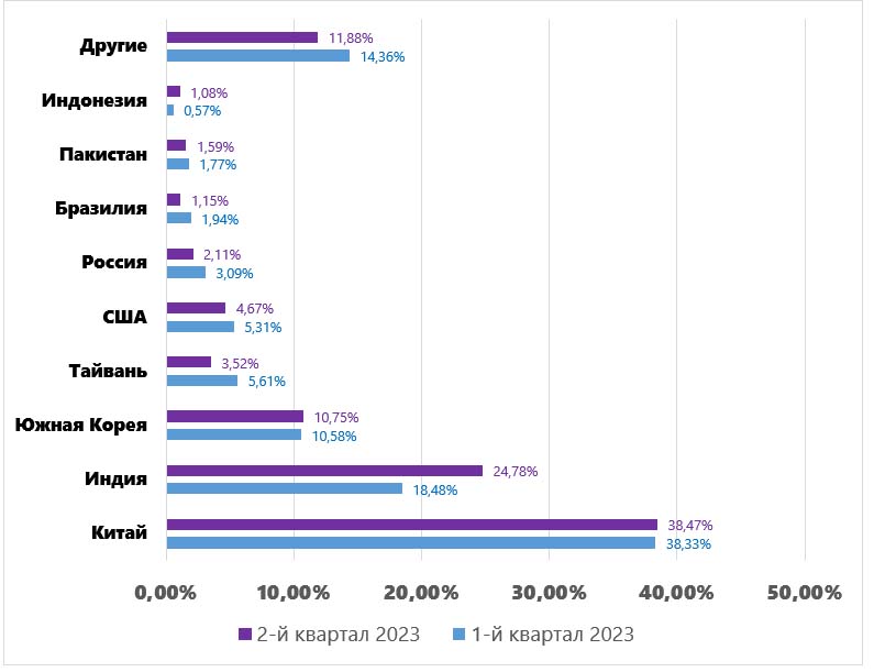 В распределении по странам наибольшее число атак фиксируется с адресов из США (33,5%), хотя отмечается некоторое снижение по сравнению с предыдущим периодом. Второе место принадлежит Китаю (почти 10%), здесь без значительных изменений. Сохранили свои позиции и остальные участники рейтинга. Россия отметилась значительным ростом и вошла в десятку, заняв 9 место (2,32%) практически удвоив свой показатель по сравнению с I кварталом.
