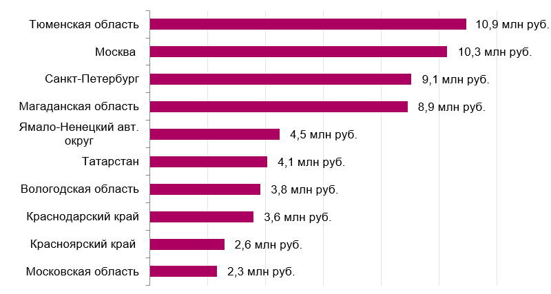 Примерно в четверти регионов компании в среднем выделяли на компьютерный софт свыше миллиона рублей за год. Лидерами по этому показателю стал бизнес Тюменской области (10,9 млн руб. на одно предприятие), Москвы (10,3 млн руб.), Санкт-Петербурга (9,1 млн руб.), Магаданской области (8,9 млн руб.) и Ямало-Ненецкого автономного округа (4,5 млн руб.).