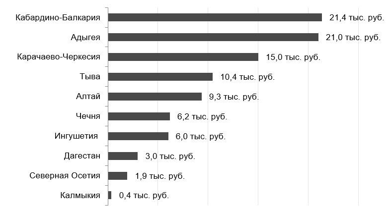Минимум денег на софт в среднем тратят компании в республиках Калмыкия (0,4 тыс. руб. на одно предприятие), Северная Осетия (1,9 тыс. руб.), Дагестан (3 тыс. руб.), Ингушетия (6 тыс. руб.), Чечня (6,2 тыс. руб.), Алтай (9,3 тыс. руб.), Тыва (10,4 тыс. руб.), Карачаево-Черкесия (15 тыс. руб.), Адыгея (21 тыс. руб.) и Кабардино-Балкария (21,4 тыс. руб.).