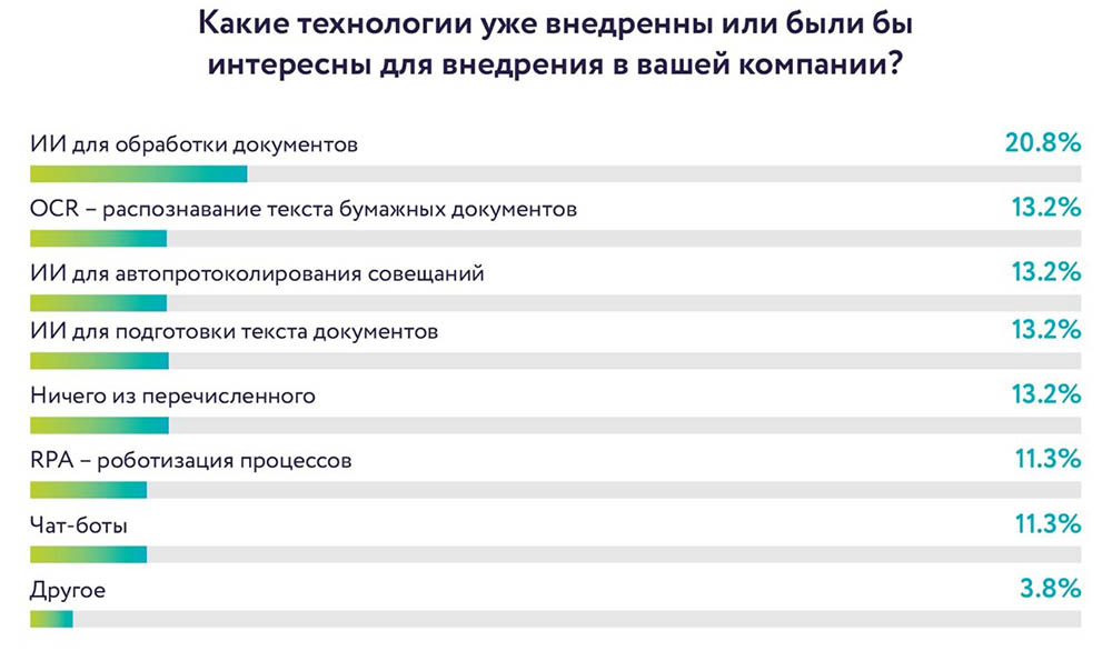 Несмотря на все вызовы, связанные с задачами импортозамещения и поддержания текущих систем, лидеры ИТ изучают инновации и планируют их применение в корпоративном ландшафте. 21% руководителей изучают возможности ИИ в части обработки документов. Одинаковый интерес компании проявляют к возможностям OCR для распознавания текста бумажных документов, ИИ для автопротоколирования совещания и ИИ для подготовки текста документов.