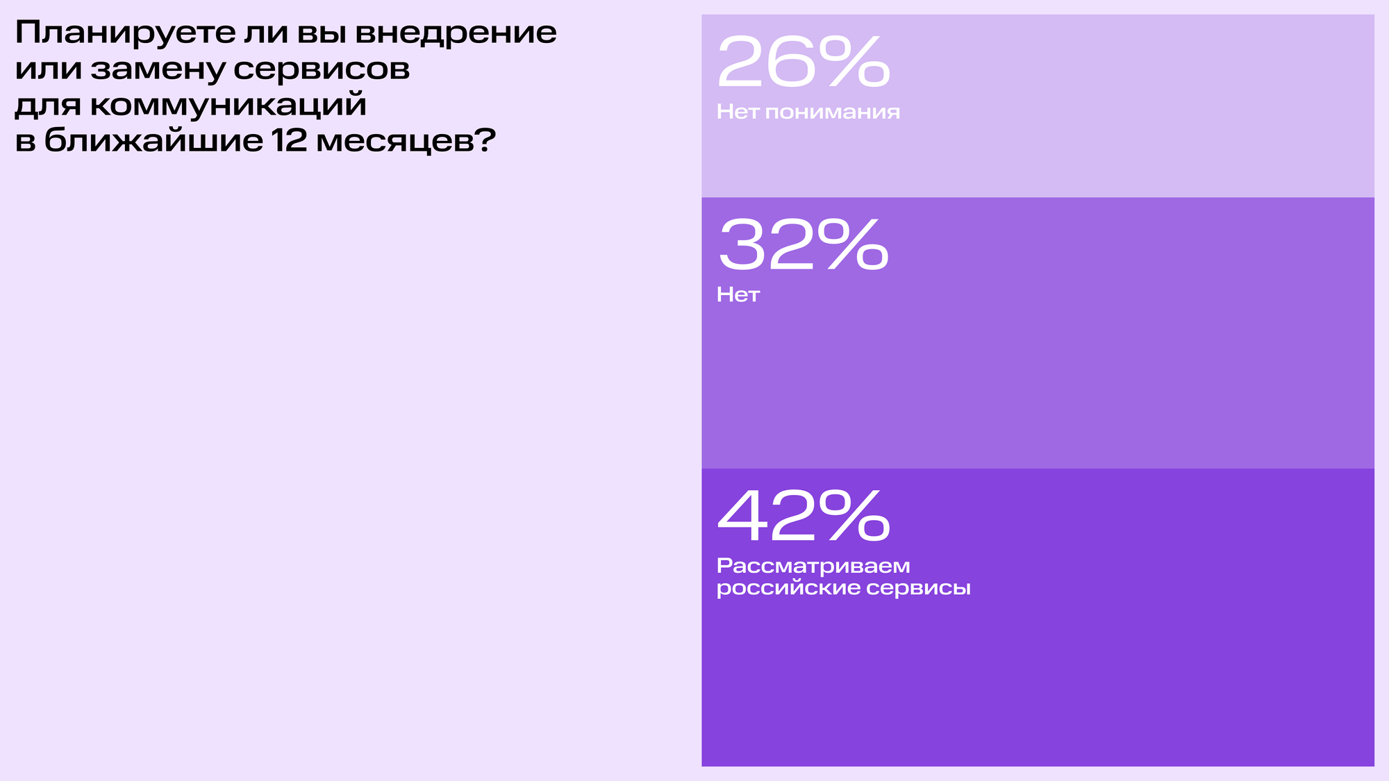 42% респондентов рассматривают внедрение или замену сервисов для коммуникаций в ближайшие 12 месяцев. В 100% случаев к внедрению предполагаются российские продукты.