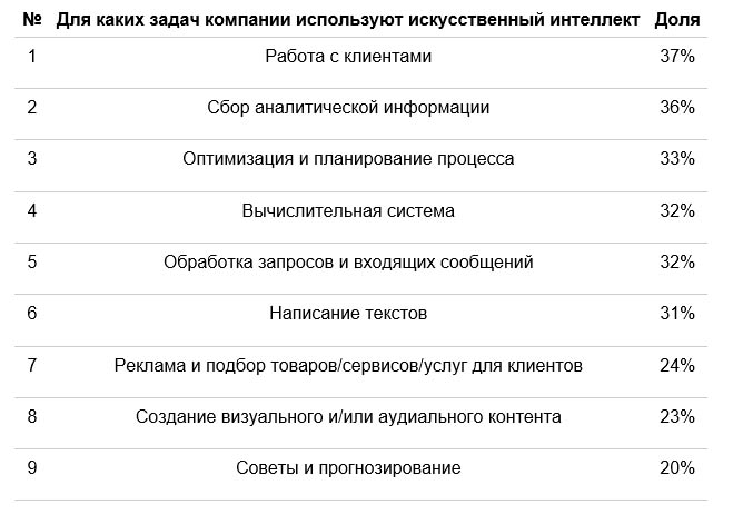 Технологии ИИ особенно востребованы при выполнении таких задач, как работа с клиентами (37%), сбор аналитической информации (36%), оптимизация и планирование процессов (33%), вычисления (32%), обработка запросов и входящих сообщений (32%) и написание текстов (31%).
