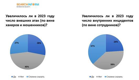 Как показали результаты опроса, проведенного «СёрчИнформ» в рамках глобального ежегодного исследования ситуации с информационной безопасностью в российских компаниях, о внешних атаках заявило 28% респондентов из сферы ритейла против 33% в 2022 году. Что касается внутренних ИБ-нарушений, их в 2023 году фиксировали 24% ритейлеров. По-прежнему остается высокая доля тех компаний, которые затруднились ответить на вопрос – 37%.