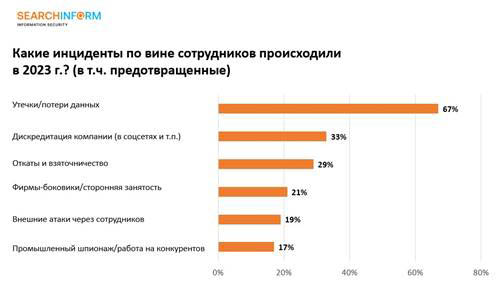 По данным исследования, в 2023 году 83% ритейлеров столкнулись с внутренними инцидентами по вине сотрудников, из них 67% фиксировали утечки данных. Также участники опроса сообщили и о других инцидентах внутренней безопасности: дискредитация компании со стороны сотрудников (33%), откаты и взяточничество (29%), фирмы-боковики/сторонняя занятость (21%) и внешние атаки через сотрудников (19%). Кроме того, 17% российских ритейлеров сталкивались с промышленным шпионажем.