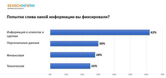 В 2023 году вместе с персональными данными (30%), как и годом ранее, в зоне повышенного риска оказалась информация о клиентах и сделках. 62% респондентов указали, что такие данные утекают чаще всего. На третьем и четвертом местах – финансовая информация (28%) и техническая документация (25%).